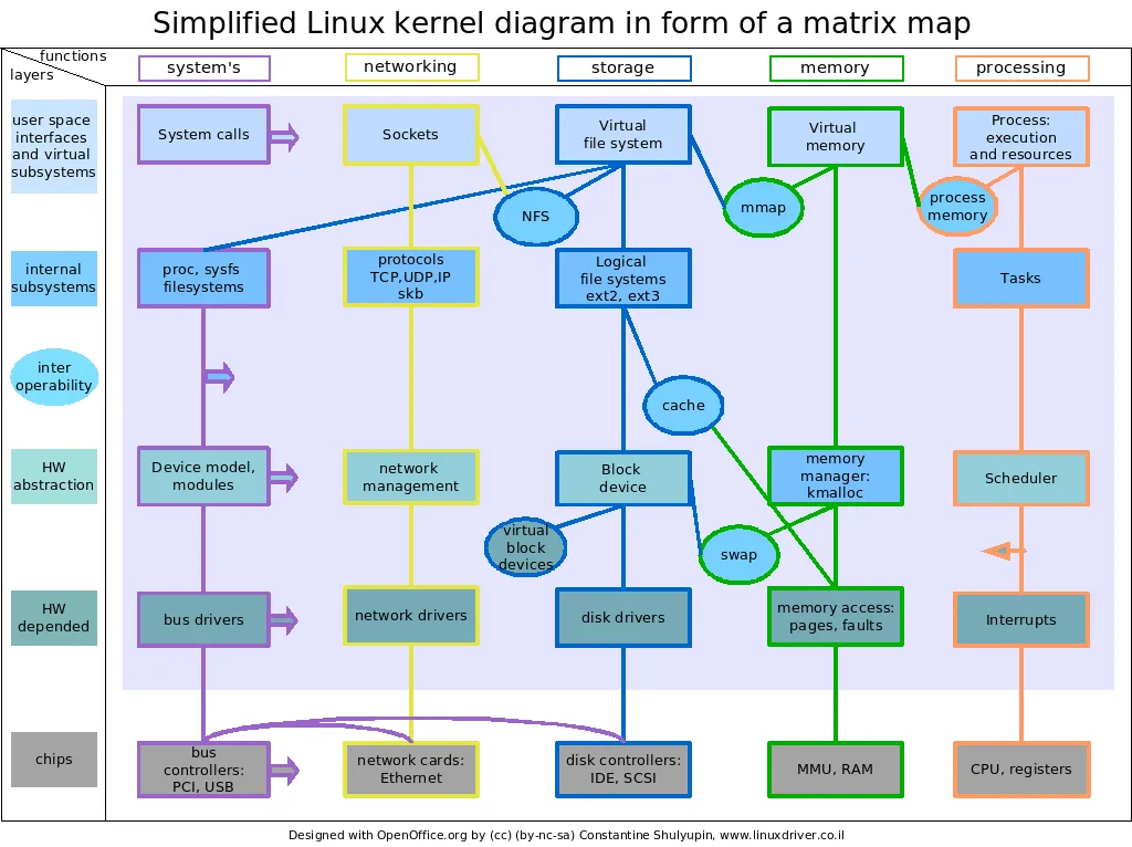 - 子系统:进程调度、内存管理、VFS(虚拟文件系统)、设备驱动、块层、网络协议栈(TCP/IP)。