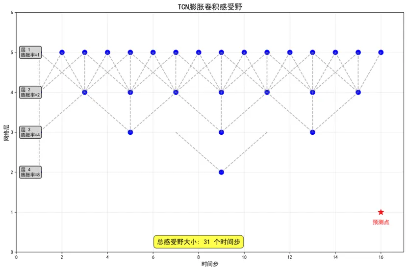 # 7. 感受野分析 plot_receptive_field(os.path.join(results_path, "Receptive_Field"))# 8. 特征重要性 - 修复了这里,传递weather_features参数 plot_feature_importance(results, target_diseases, weather_features, os.path.join(results_path, "Feature_Importance"))# 9. 多步骤预测 plot_multi_step_forecast(results, target_diseases, os.path.join(results_path, "Multi_Step_Forecast"))# 10. 保存模型和结果 performance_summary = save_models_and_results(results, target_diseases, os.path.join(results_path, "Saved_Models"))# 11. 生成报告 analysis_report = generate_reports(target_diseases, os.path.join(results_path, "Reports"))# 输出汇总信息print("\n=== TCN建模分析完成 ===")print(f"分析疾病数量: {len(target_diseases)}")print("分析时间范围: 1981-2015(训练) -> 2016-2025(预测)")print(f"使用的气象特征: {', '.join(weather_features)}")print("TCN架构: 4个残差块,膨胀率[1,2,4,8],滤波器64个")print(f"总生成图表数量: {len(target_diseases) * 7 + 4} 个\n")print("主要结果目录:")print("1. Network_Architecture - TCN网络结构图")print("2. Training_History - 训练过程可视化")print("3. Prediction_Comparison - 预测结果对比")print("4. Residual_Analysis - 残差分析")print("5. Performance_Comparison - 模型性能比较")print("6. Prediction_Intervals - 预测区间")print("7. Receptive_Field - 膨胀卷积感受野")print("8. Feature_Importance - 特征重要性分析")print("9. Multi_Step_Forecast - 多步骤预测")print("10. Saved_Models - 保存的模型文件")print("11. Reports - 分析报告\n")print("模型性能摘要:")print(performance_summary.to_string(index=False)) best_model = performance_summary.loc[performance_summary['Test_R2'].idxmax()]print("\n最佳性能模型:")print(best_model.to_string())print("\nTCN模型优势:")print("- 使用因果卷积确保不会使用未来信息")print("- 膨胀卷积扩大感受野,捕获长期依赖")print("- 残差连接缓解梯度消失问题")print("- 并行计算,训练速度通常比RNN更快")print("- 稳定的梯度传播,适合长序列建模")print(f"\n所有结果已保存到: {results_path}")if __name__ == "__main__": main()