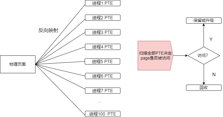 实际上,Linux 内核的 LRU 在算法成本上可能极高,一个简单的事实是,现代 CPU 通常会在页表 Page Table Entry(PTE)中含有一个 reference bit,如果硬件访问过这一页,这个 bit 会被硬件自动设置,这个 PTE 对应的 page 会被内核识别为 young(青春年少)。在 LRU 算法的 active、inactive 变迁,以及页面回收时,我们是通过扫描 PTE 的 reference bit 来决定页面是否 young 的。但是,当一个页面被许多进程共享的时候,比如 100 个进程,我们则需要通过所谓的反向映射技术,找到这 100 个进程的 100 张页表,来一一读取 PTE 的 reference bit: