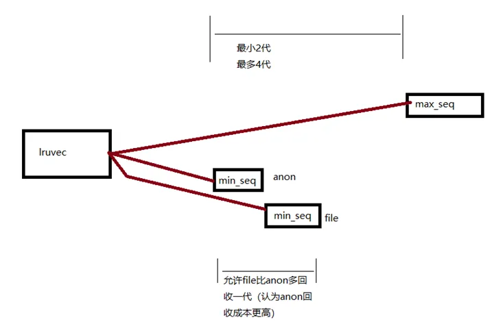 MGLRU 最年轻的一代是 max_seq,其对于 anon 和 file 来说,总是相等的;最老的一代,则区分为:min_seq[anon] 和 min_seq[file]。因为内存回收的时候,允许 file 比 anon 更激进地多回收一代,所以 anon 和 file 的 min_seq 不一定完全相等。
