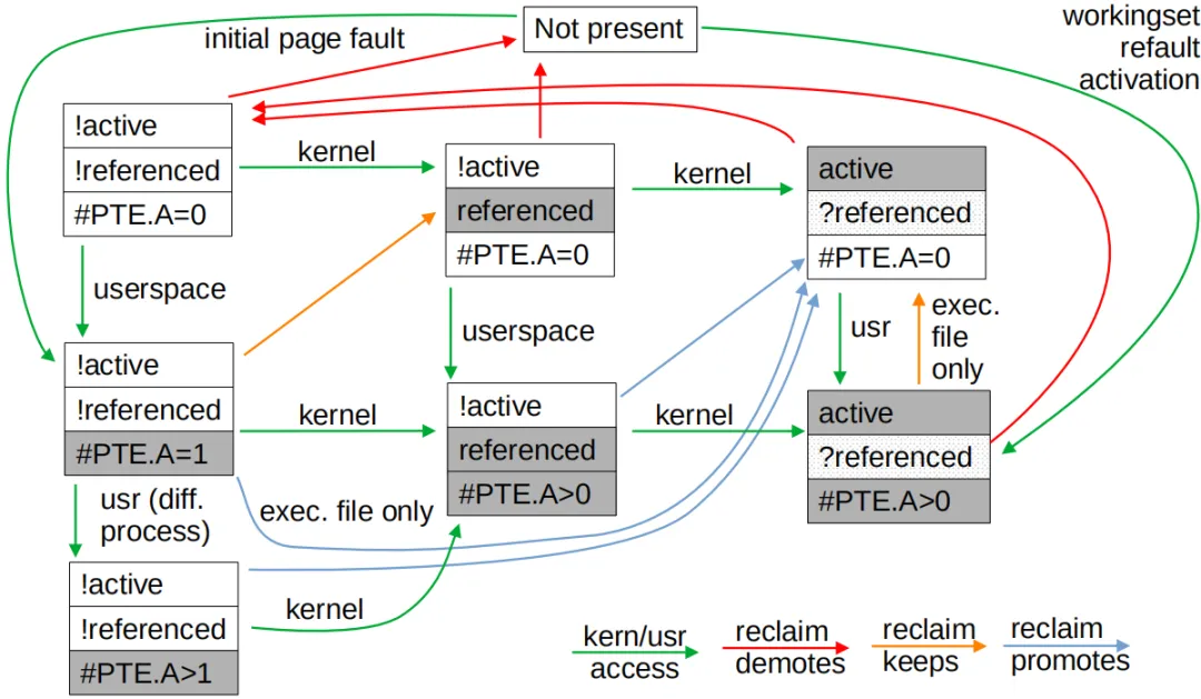 另外,原先内核 LRU 的设计,通常会通过二次尝试法, mapped 的 page 也是一次访问进入 inactive,二次访问再进入 active(除非是代码段、或被多个进程同时访问到了、或之前回收的页面再进来因 workingset 保护以避免 thrashing,可以一次性升级);这避免了把只访问一次的 page 提升到 active 难以回收的状态,可能有些 workload 可能就是把某些内存只访问一次呢?