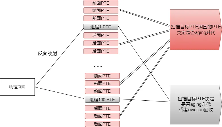 MGLRU 有一个非常有特色的地方,它在通过反向映射查看 PTE 的 reference bit 时,会利用空间局部性原理,look-around 特定 PTE 周围的几十个 PTE,比如下图目标黑色 PTE 周围的红色 PTE: