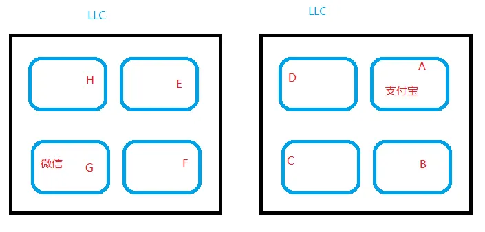 我们简单地介绍一下这个工作的背景。Linux 内核有较好的 last level cache(通常是 L3 cache)意识,在调度器的负载均衡场景,它可以把任务铺开到不同的 LLC domain,从而让任务享有更多的 cache 资源,并减小 cache 之间的 contention。比如系统有 8 个 CPU,每 4 个共享一个 LLC,运行微信和支付宝两个任务,下面的运行方式可能较为理想,微信和支付宝在 2 个分开的 domain 里面运行,有利于最大化它们各自能拿到的系统资源。