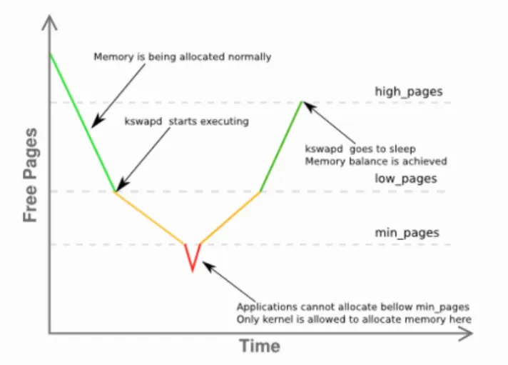 达到 low 水位的时候,kswapd 开始异步回收内存;达到 min 水位的时候,进程被堵住进行 direct reclamation 同步回收内存。