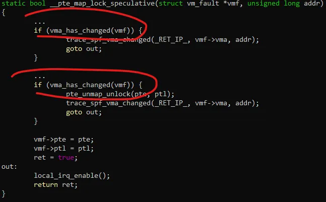 内核的进程 VMA 原本保存于一个被修改过的红黑树,受到位于 mm_struct 内的 mmap_sem(5.8 后更名为 mmap_lock)保护。mmap_sem 是 Linux 内核臭名昭著的大坑,这个锁的竞争也成为内核最重要的性能瓶颈之一。历史上,人们付出了无数的努力来降低这个锁的竞争,这里面最著名的莫过于在 page fault 的处理中,采用 SPF(Speculative page faults),尽可能避免去拿 mmap_sem 这个锁。简单来说,SPF 采用马伊琍童鞋“且行且珍惜”的方式,边走边看,先不拿 mmap_sem,但是每走一个关键步骤,就查询是否其他地方有并存的 VMA 以及 PTE 页表修改,如果有这种并发的过程,再考虑让 page fault 重新 retry,获取 mmap_sem。比如充满了这种“是否苍天变了心”的判断: