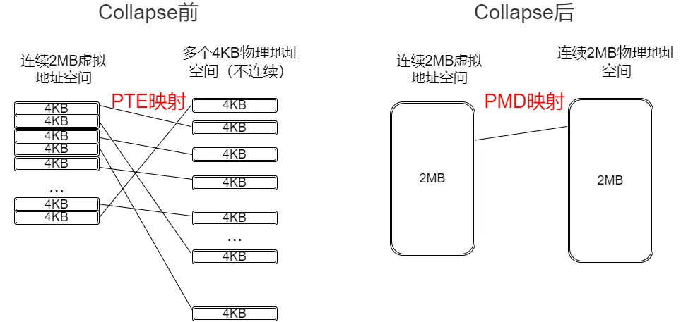 透明大页(THP)的性能一直因为透明大页本身生命周期的不确定性而变幻莫测。首先,Linux 内核往往要经过一个 collapse 过程,把小页塌缩(collapse)为大页: