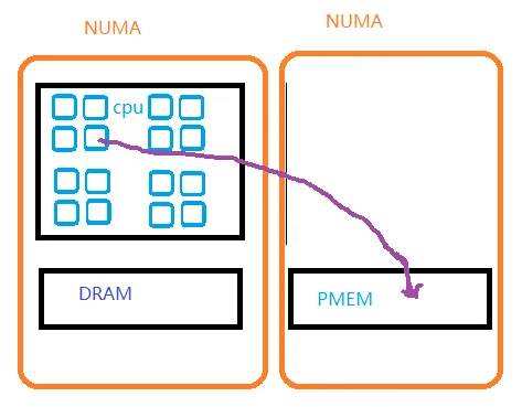 而那些单独的 DRAM 以外的 memory,比如 PMEM,可以成为单独的 cpu-less 的 NUMA 节点。比如如下硬件拓扑下 NUMA2-NUMA3,是两片单独的 PMEM。