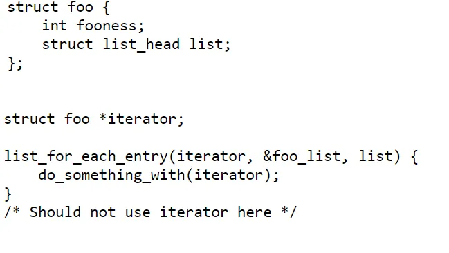迭代器总是定义在 list_for_each_entry() 之外的,这导致循环迭代完成后,代码仍然可能访问 iterator,从而导致 bug,比如 Jakob 企图修复的其中一个“bug”就是: