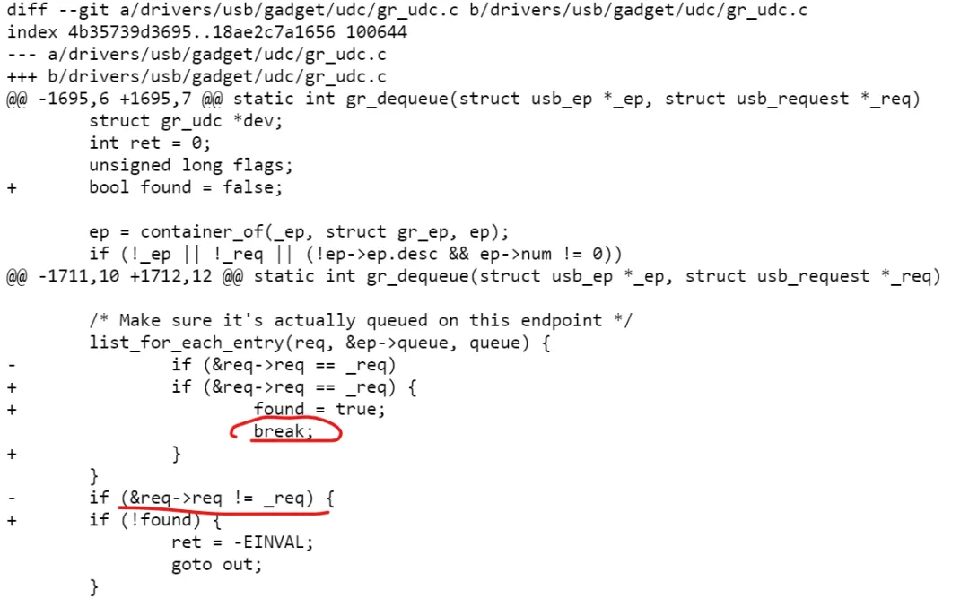这个可能的“bug”的确有些狗血,哪怕 list_for_each_entry() 的循环没有查到,也即没有 break,最终指向 head 的 req 的 req->req 作为一片野内存,在各种内存排布的机缘巧合下仍然可能会等于 _req?