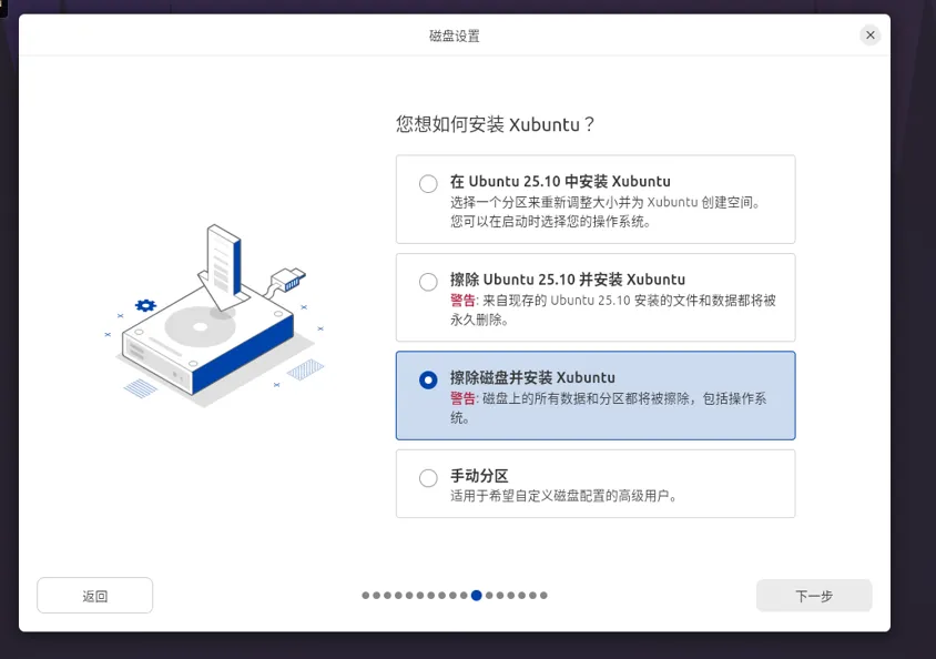 这里是关键的一步,要确认安装的目标硬盘的分区情况,由于之前安装了Kubuntu Linux,这里识别到了,就出现了关于Kubuntu Linux 25.10的选项,但只能识别出是Ubuntu Linux。