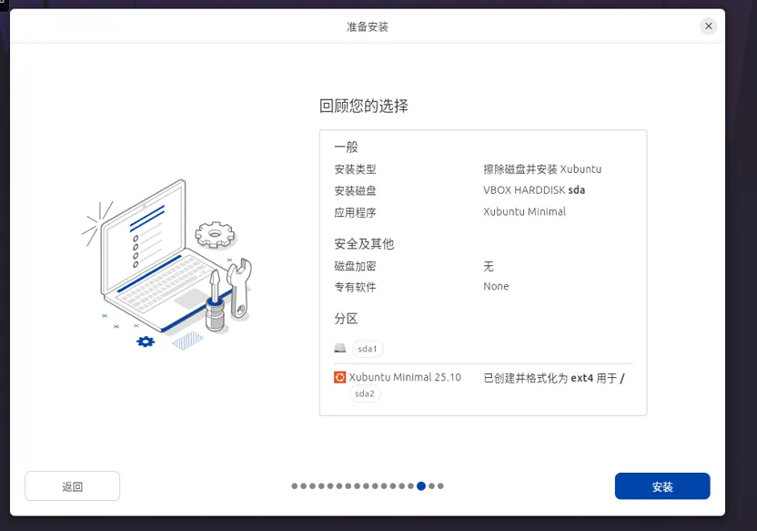 在这里就是安装前的最后一步,确认之前所有的设置项,一旦有不合适的内容,还可以返回之前的操作,再次设置,这里硬盘还未写入一切都还来得及。