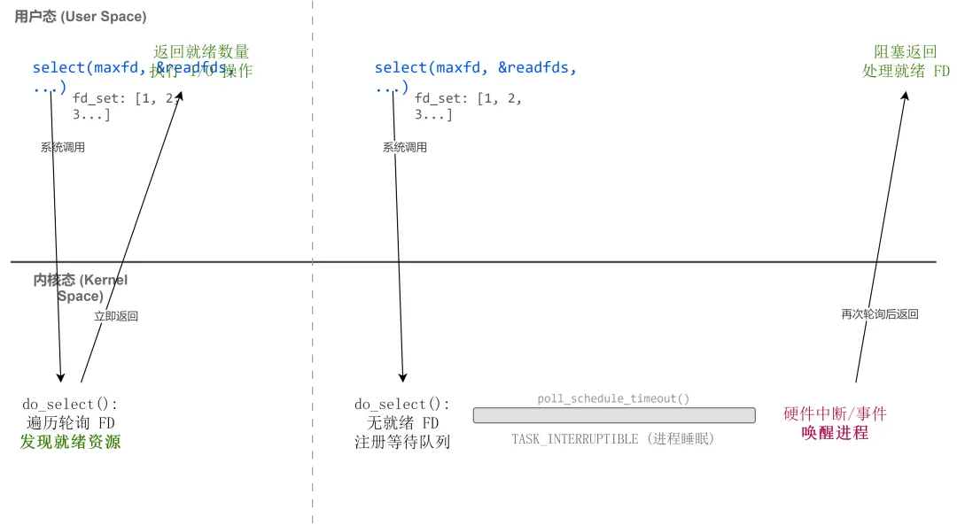 若有任意fd就绪(如readfds中的fd有数据可读),内核修改fd_set,标记就绪fd,将fd_set拷贝回用户态,select返回就绪fd数量;