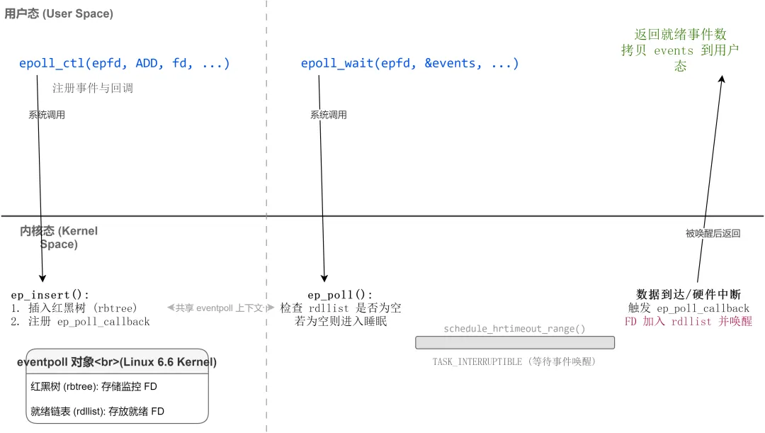 epoll的应用层编程需用到三个核心系统调用,Linux 6.6内核中均保持兼容,且推荐使用epoll_create1(epoll_create的改进版,支持设置标志位)替代传统的epoll_create。