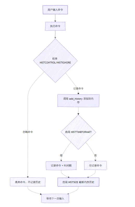Bash 启动时调用 read_history(),从 HISTFILE(默认 ~/.bash_history)逐行读取命令,填充到内存历史列表。- 若文件不存在,则创建空文件(除非