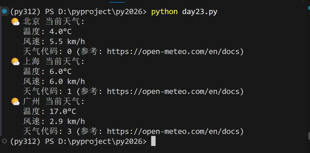 我们将使用 Open-Meteo(无需 API Key,免费公开):