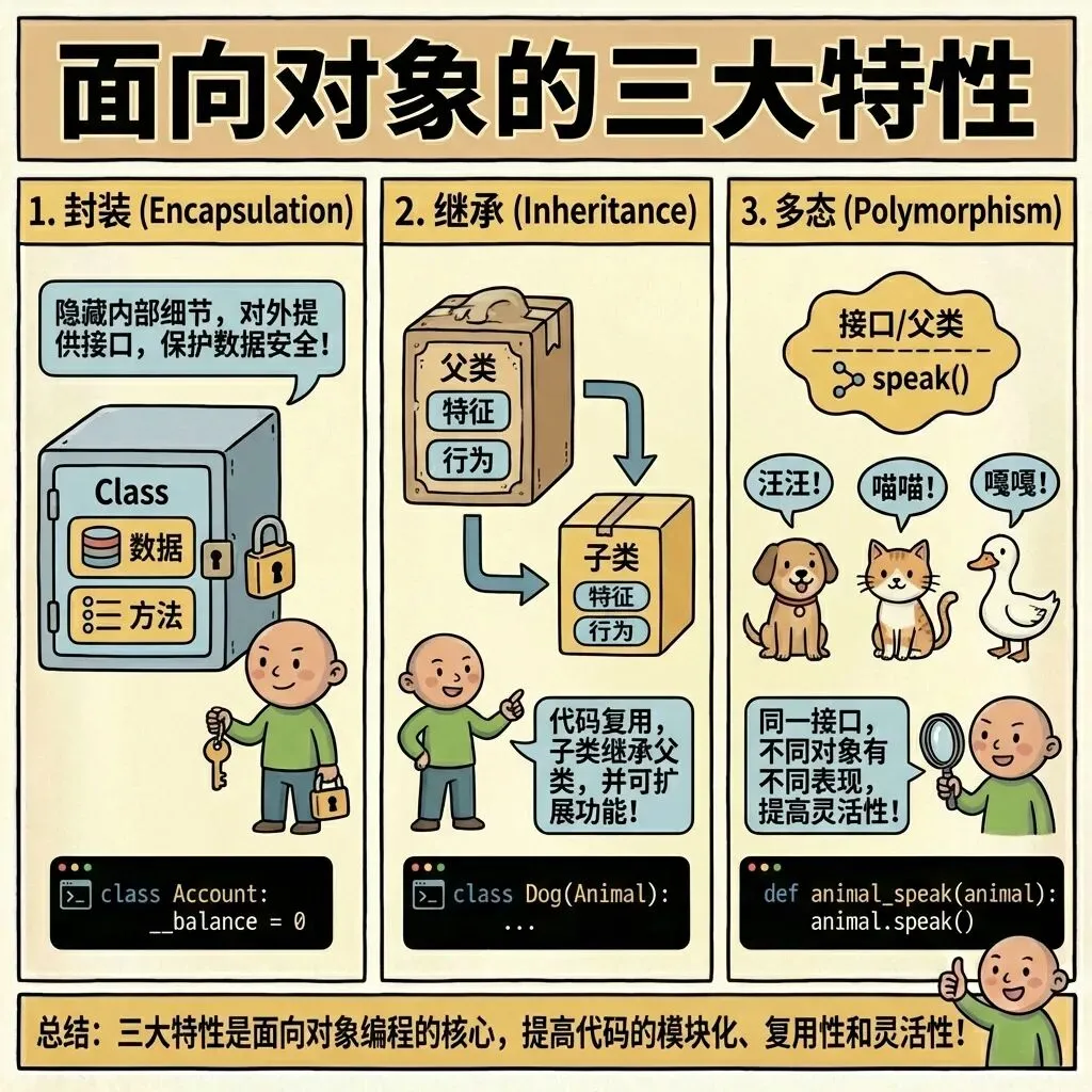 # 私有属性class Student:def __init__(self, name, age):# 普通属性:可以直接外部访问self.name = name# 私有属性:以双下划线 __ 开头,限制外部直接访问self.__age = age # 私有属性:年龄# 提供公开(API接口)方法,用于获取私有属性(读)def get_age(self):"""获取私有属性__age的值"""return self.__age# 提供公开方法(API接口),用于修改私有属性(写)def set_age(self, new_age):"""修改私有属性__age"""if isinstance(new_age, int) and 0 < new_age < 100:self.__age = new_ageelse:print("年龄必须是0-100之间的整数!")# 1. 创建对象stu = Student("小明", 18)# 2. 访问普通属性print("直接访问普通属性name:", stu.name) # 输出:直接访问普通属性name:小明# 3. 尝试直接访问私有属性(会报错,体现私有性)# print(stu.__age) # 取消注释会报错:AttributeError: 'Student' object has no attribute '__age'# 4. 通过公开方法访问私有属性print("通过方法获取年龄:", stu.get_age()) # 输出:通过方法获取年龄:18# 5. 通过公开方法修改私有属性(合法值)stu.set_age(19)print("修改后通过方法获取年龄:", stu.get_age()) # 输出:修改后通过方法获取年龄:19