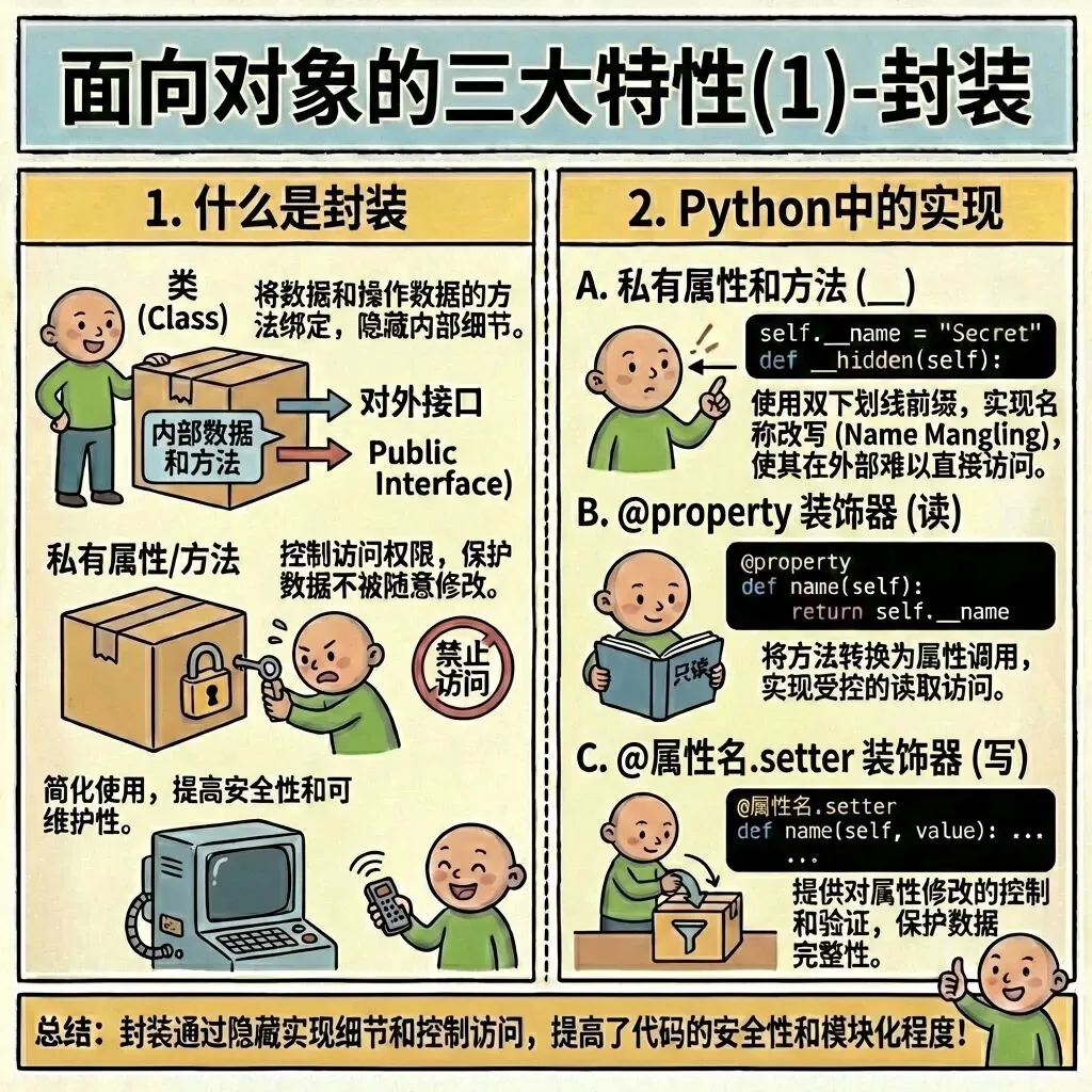 总结:今日我们学习了Python基础篇-面向对象的三大特性(1)-封装:在Python基础篇,封装的核心是把属性设为私有属性(强制以双下划线 __ 开头),避免外部直接访问和随意修改,保护数据安全。为了方便读写私有属性,我们使用@property实现只读访问,再通过@属性名.setter实现可修改,让外部可以像使用普通属性一样简洁地获取和设置值,同时还能在内部增加数据校验,让代码更安全、规范、易维护。后续我们将持续学习Python基础知识,祝每一位study er学习愉快。