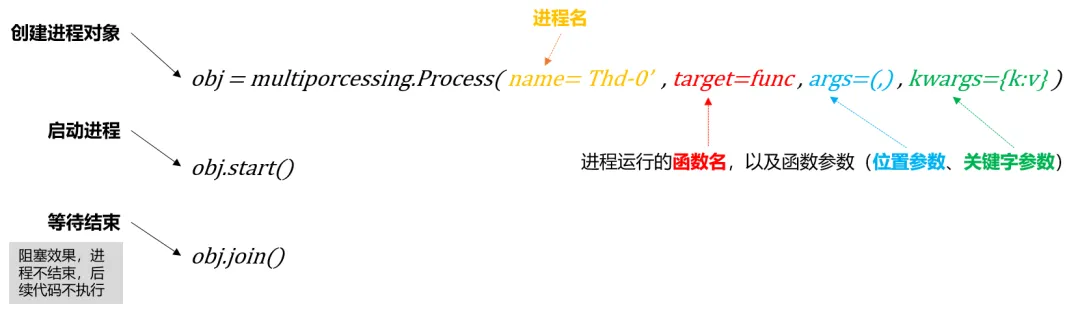 import timeimport multiprocessingdef myfunc(name): t0 = time.time() print(f' Process {name} : Start') time.sleep(2) print(f' Process {name} : End. Time={time.time()-t0}')if __name__=='__main__': # 和多线程的区别是,多进程必须有该语句开始 print('Process test : Start') t0 = time.time() proc = [] for i in range(3): # 创建进程 obj = multiprocessing.Process(target=myfunc,args=(i,)) proc.append(obj) for i in range(3): # 启动进程 proc[i].start() for i in range(3): # 等待进程结束,此时对进程的join()方法可以运行,但其余的代码不可执行。 proc[i].join() print(f'Process test : End.Time={time.time()-t0}')