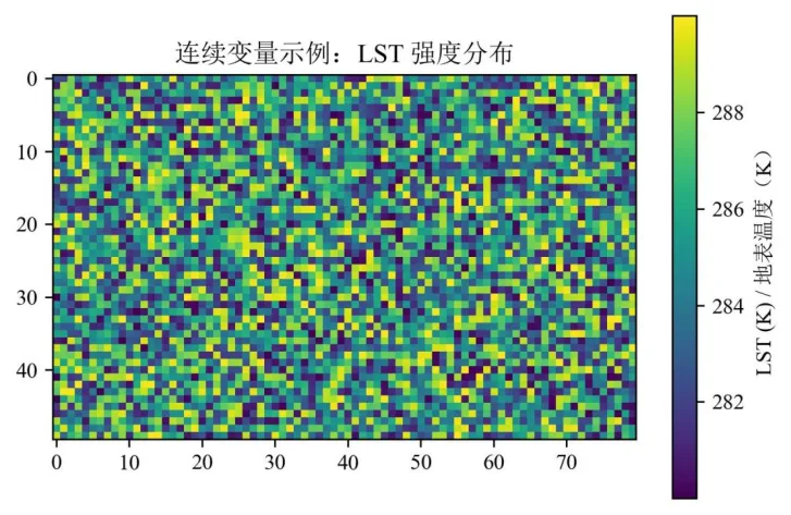 import osimport numpy as npimport matplotlib as mplimport matplotlib.pyplot as pltfrom matplotlib import font_manager as fmfm.fontManager.addfont(r"C:\Windows\Fonts\times.ttf")fm.fontManager.addfont(r"C:\Windows\Fonts\simsun.ttc")mpl.rcParams["font.family"] = ["Times New Roman", "SimSun"]mpl.rcParams["axes.unicode_minus"] = FalseOUT_DIR = r"D:\py_figs"os.makedirs(OUT_DIR, exist_ok=True)# 假数据:二维连续变量data = np.random.rand(50, 80) * 10 + 280fig, ax = plt.subplots(figsize=(6, 4))im = ax.imshow(data, cmap="viridis")# 连续:顺序色带ax.set_title("连续变量示例:LST 强度分布")cbar = fig.colorbar(im, ax=ax)cbar.set_label("LST (K) / 地表温度(K)")fig.savefig(os.path.join(OUT_DIR, "cmap_sequential.jpg"), dpi=300, bbox_inches="tight")plt.close(fig)