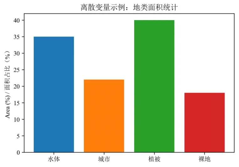 import osimport numpy as npimport matplotlib as mplimport matplotlib.pyplot as pltfrom matplotlib import font_manager as fmfm.fontManager.addfont(r"C:\Windows\Fonts\times.ttf")fm.fontManager.addfont(r"C:\Windows\Fonts\simsun.ttc")mpl.rcParams["font.family"] = ["Times New Roman", "SimSun"]mpl.rcParams["axes.unicode_minus"] = FalseOUT_DIR = r"D:\py_figs"os.makedirs(OUT_DIR, exist_ok=True)labels = ["水体", "城市", "植被", "裸地"]values = [35, 22, 40, 18]fig, ax = plt.subplots(figsize=(6, 4))colors = plt.get_cmap("tab10").colors[:len(labels)]# 离散:定性色带ax.bar(labels, values, color=colors)ax.set_title("离散变量示例:地类面积统计")ax.set_ylabel("Area (%) / 面积占比(%)")fig.savefig(os.path.join(OUT_DIR, "cmap_qualitative.jpg"), dpi=300, bbox_inches="tight")plt.close(fig)