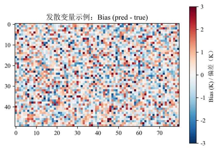 import osimport numpy as npimport matplotlib as mplimport matplotlib.pyplot as pltfrom matplotlib import font_manager as fmfm.fontManager.addfont(r"C:\Windows\Fonts\times.ttf")fm.fontManager.addfont(r"C:\Windows\Fonts\simsun.ttc")mpl.rcParams["font.family"] = ["Times New Roman", "SimSun"]mpl.rcParams["axes.unicode_minus"] = FalseOUT_DIR = r"D:\py_figs"os.makedirs(OUT_DIR, exist_ok=True)# 假数据:误差场(正负)err = (np.random.randn(50, 80)) * 1.2 # K# 发散:必须对称范围a = 3.0fig, ax = plt.subplots(figsize=(6, 4))im = ax.imshow(err, cmap="RdBu_r", vmin=-a, vmax=a)ax.set_title("发散变量示例:Bias (pred - true)")cbar = fig.colorbar(im, ax=ax)cbar.set_label("Bias (K) / 偏差(K)")fig.savefig(os.path.join(OUT_DIR, "cmap_diverging.jpg"), dpi=300, bbox_inches="tight")plt.close(fig)