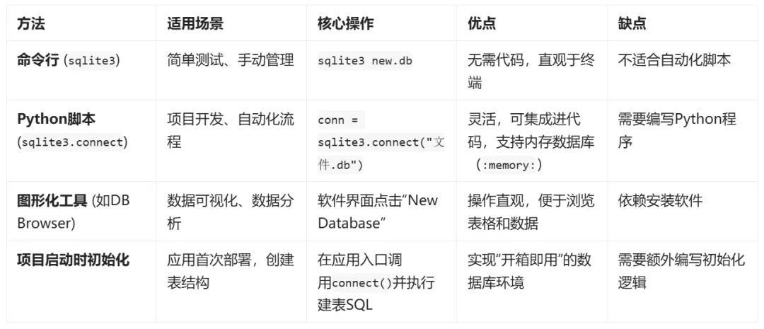 SQLite创建数据库的方法对比,帮你根据场景快速决策: