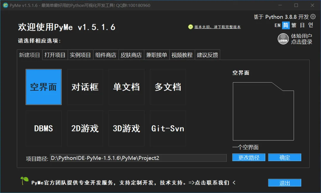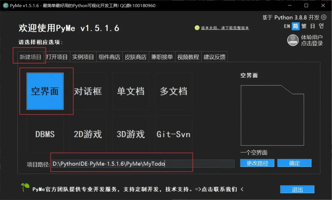启动PyMe后,点击“新建项目”,选择“空界面项目”,设置项目保存路径(比如"D:\PythonIDE-PyMe-1.5.1.6\PyMe\MyTodo")。