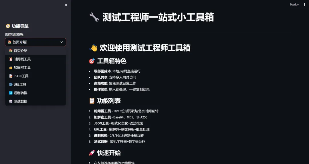 今天给大家分享一款「测试工程师专属一站式小工具箱」,基于Python + Streamlit开发,专为自用和公司内网团队打造,零部署成本、适配Windows/mac,高频需求全覆盖,上手即提速!