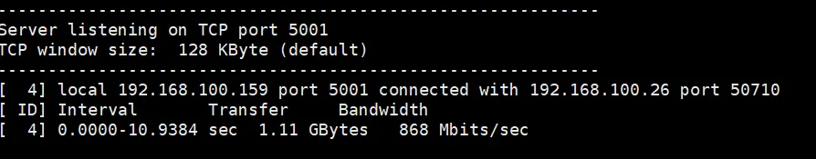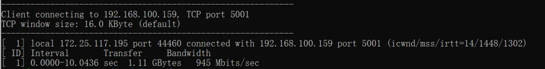 这里的服务器 IP 地址就是刚才启动服务器模式的设备的 IP。执行后,客户端会向服务器发送数据,测试完成后会显示详细的测速结果,包括带宽速度(单位通常为 Mbps)、传输的数据量、传输时间等。