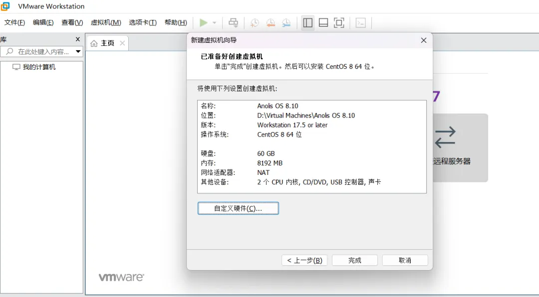 1、打开VMware,点击“新建虚拟机”,选择“经典(推荐)”,下一步;2、选择“稍后安装操作系统”,下一步(新手不选自动安装,避免出错);3、客户机操作系统选“Linux”,版本选“CentOS 8 64位”(重点:VMware无Anolis OS选项,因二者完全兼容,选此版本不影响使用),下一步;4、虚拟机名称自定义(建议“Anolis OS 8.10”),位置选非系统盘(如D盘),下一步;5、磁盘容量设20GB(根据个人磁盘空间而定),选择“将虚拟磁盘存储为单个文件”,下一步;6、点击自定义硬件,可查看和调整硬件配置(可根据自身物理机配置调整虚拟机硬件配置,配置越高,虚拟机性能越强)。调整内存调整CPU,点击确定。