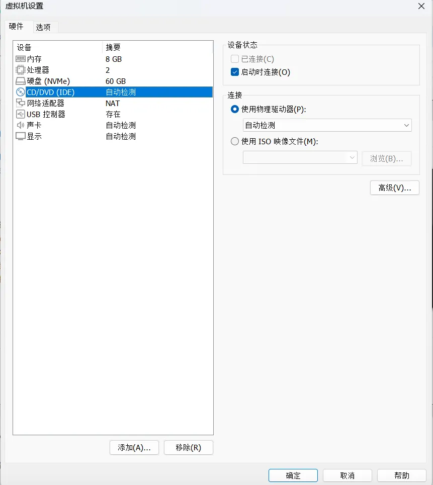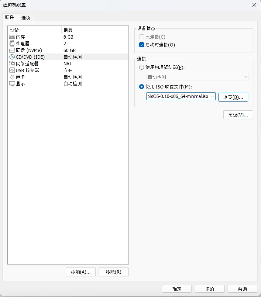 3、务必勾选“启动时连接”,点击“确定”,镜像挂载完成。