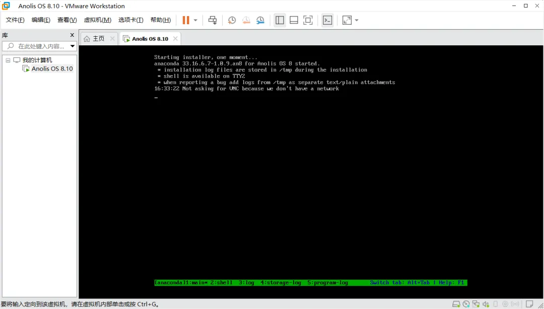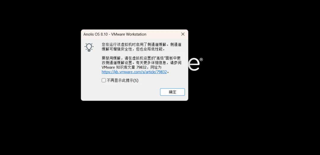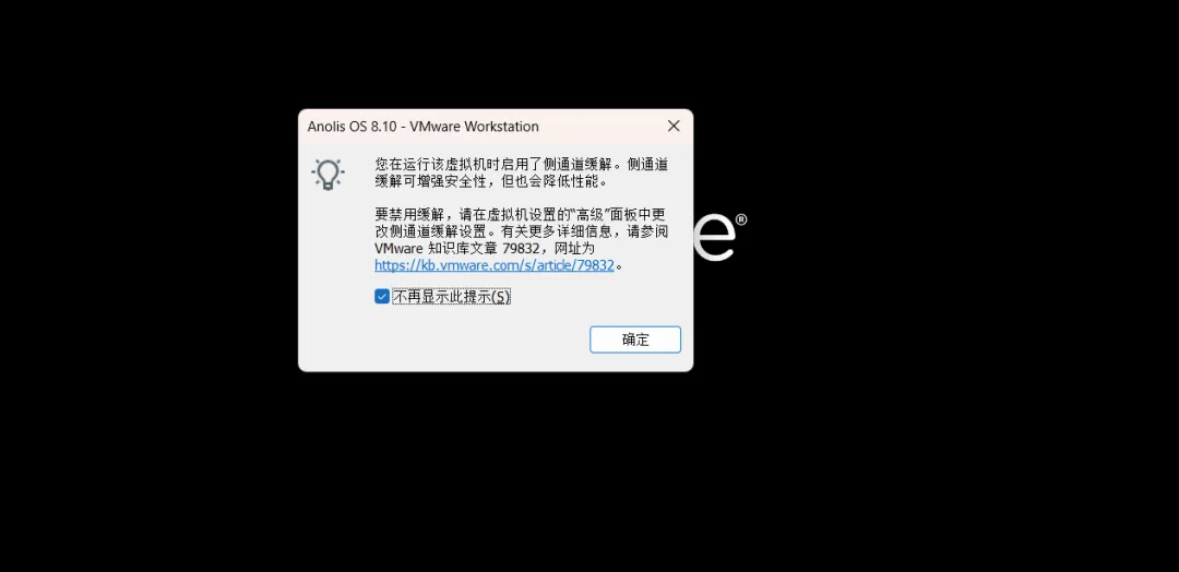 1、选中虚拟机,点击“启动此虚拟机”,进入Anolis OS安装界面;出现上图提示,直接勾选不在提示,确定。
