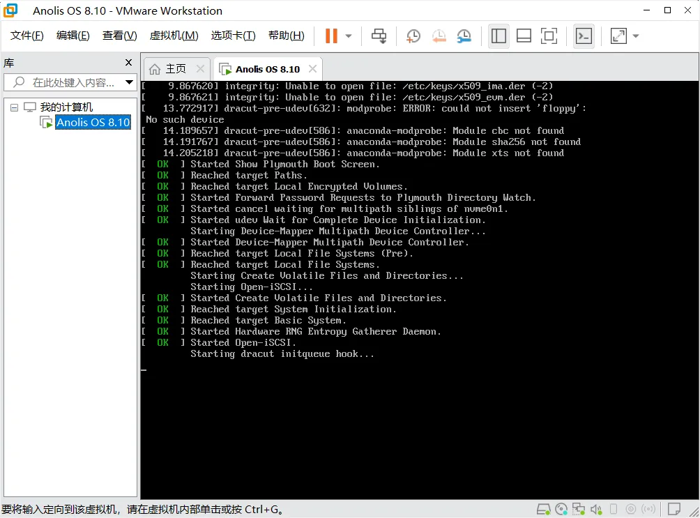 2、用键盘上下键选择“Install Anolis OS 8.10”,按回车键加载安装程序(等待1-2分钟);这一步鼠标会无法移出虚拟机界面,可按Ctrl+ALT键移出。
