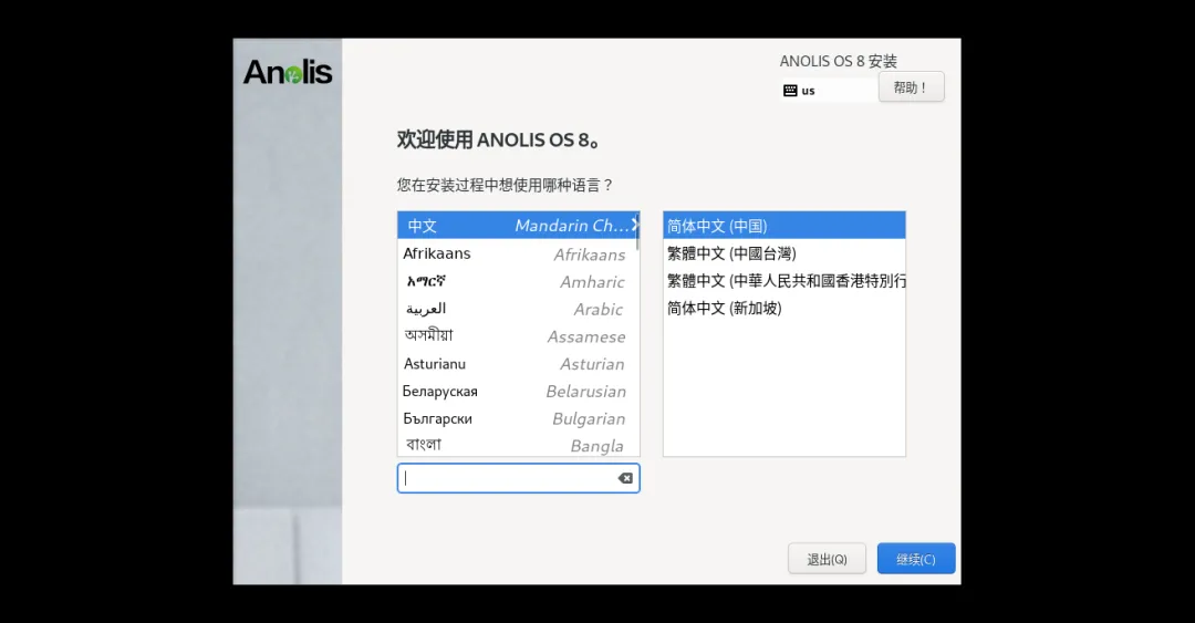 3、加载完成后,选择“中文(简体)”,点击“继续”(仅影响安装界面,不影响系统)。