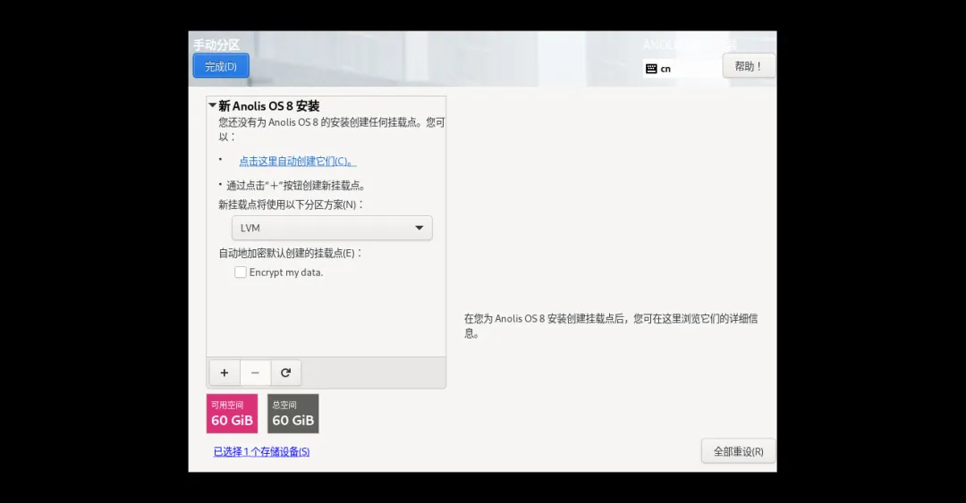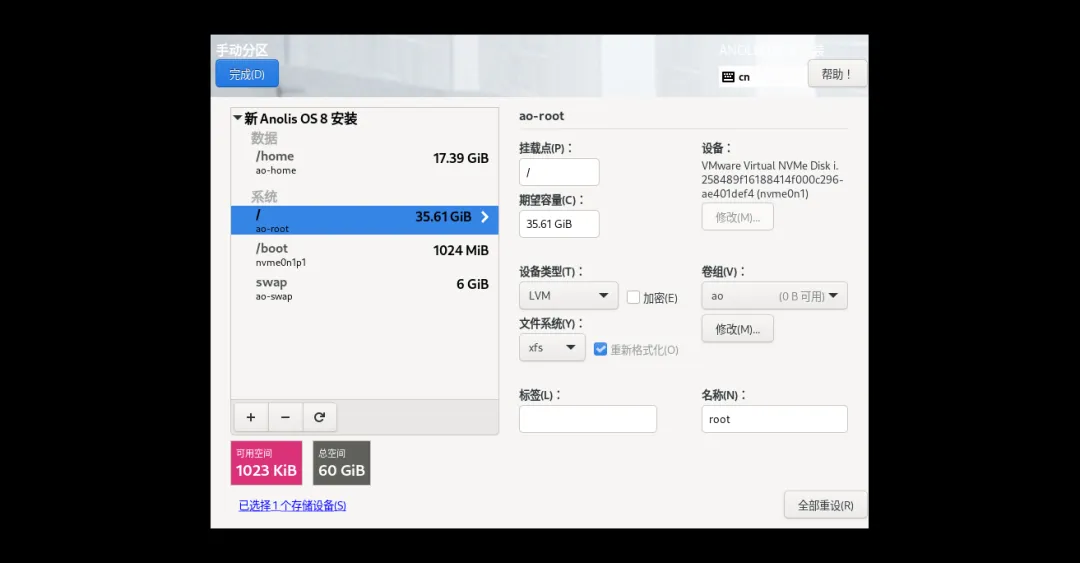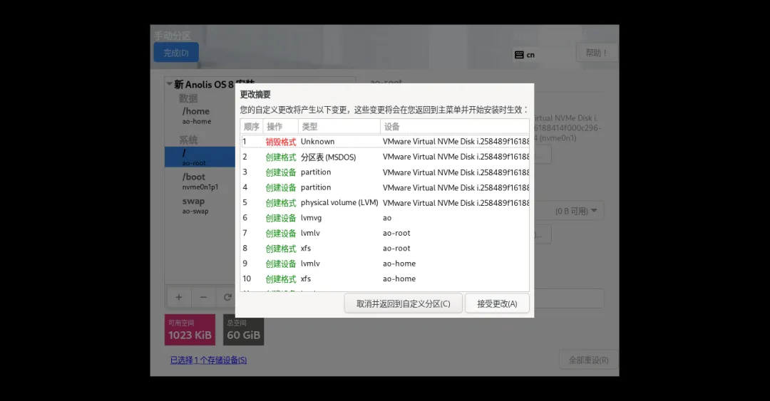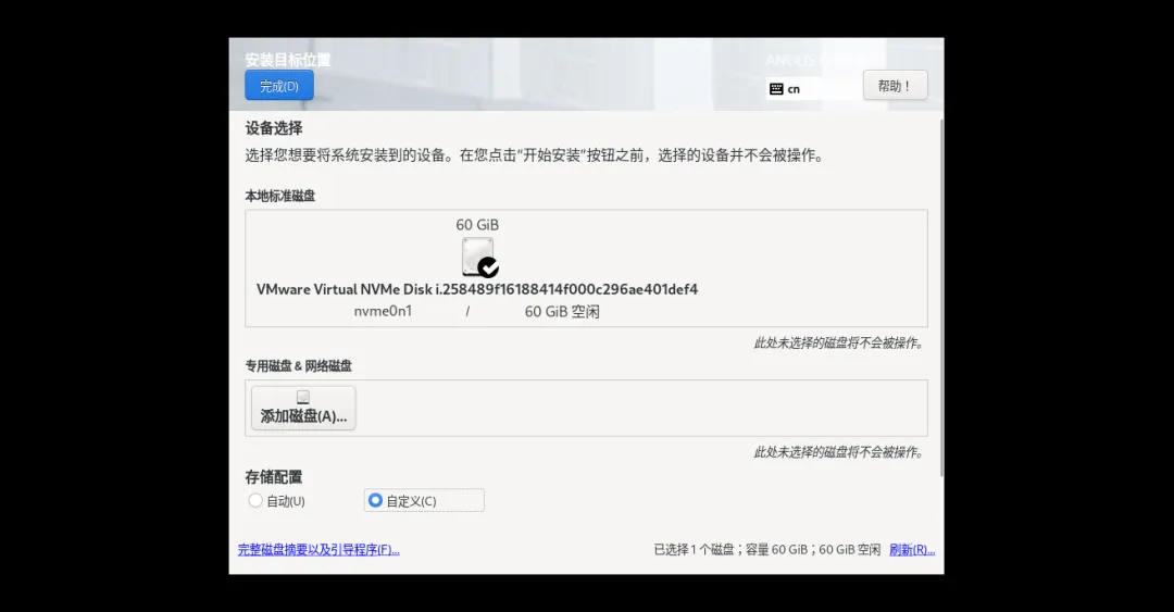1、配置“安装目的地”:点击进入,选中虚拟磁盘,选择“自定义”→“完成”,再选“自动创建分区”→“完成”→“接收更改”,返回摘要界面;自动完成后,如果想调整大小,还可直接调整。我通常喜欢完全手动分区。可以直接给了boot和swap外,剩余全都给/分区。