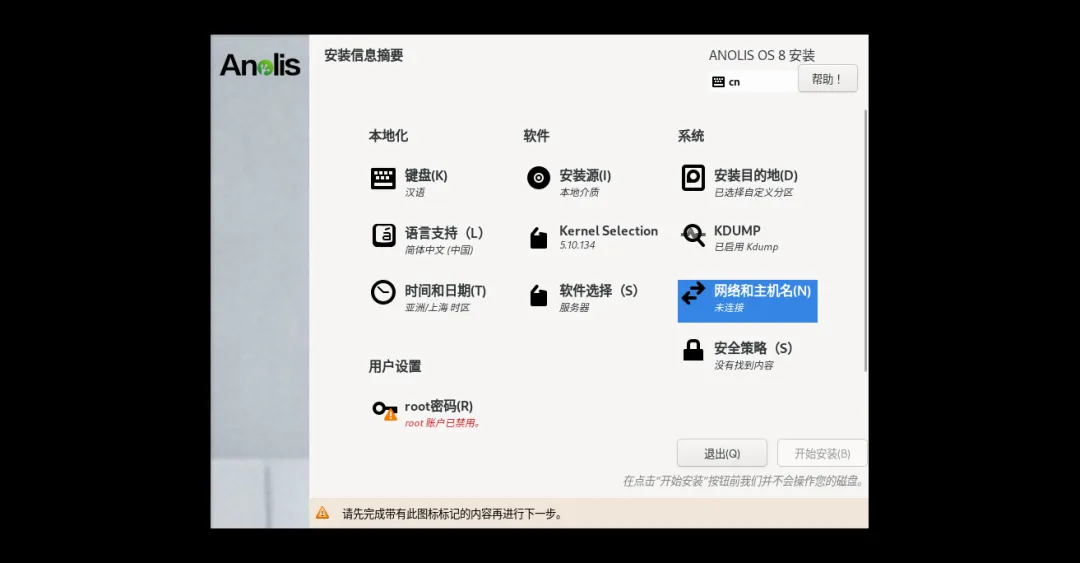 进入“安装摘要”界面,重点3个标红选项 - “安装目的地”“网络和主机名”“root密码”,按以下顺序操作: