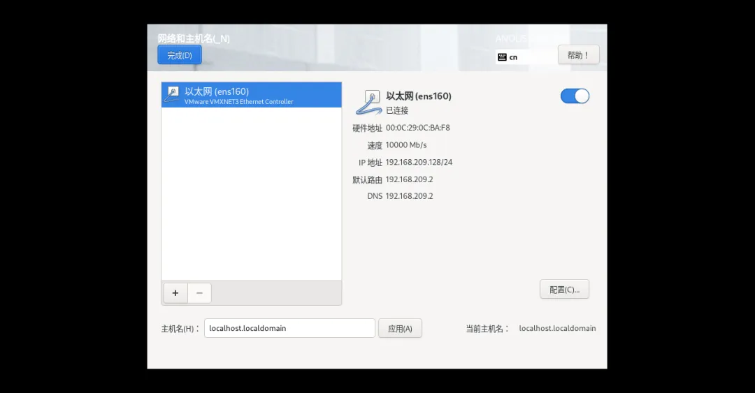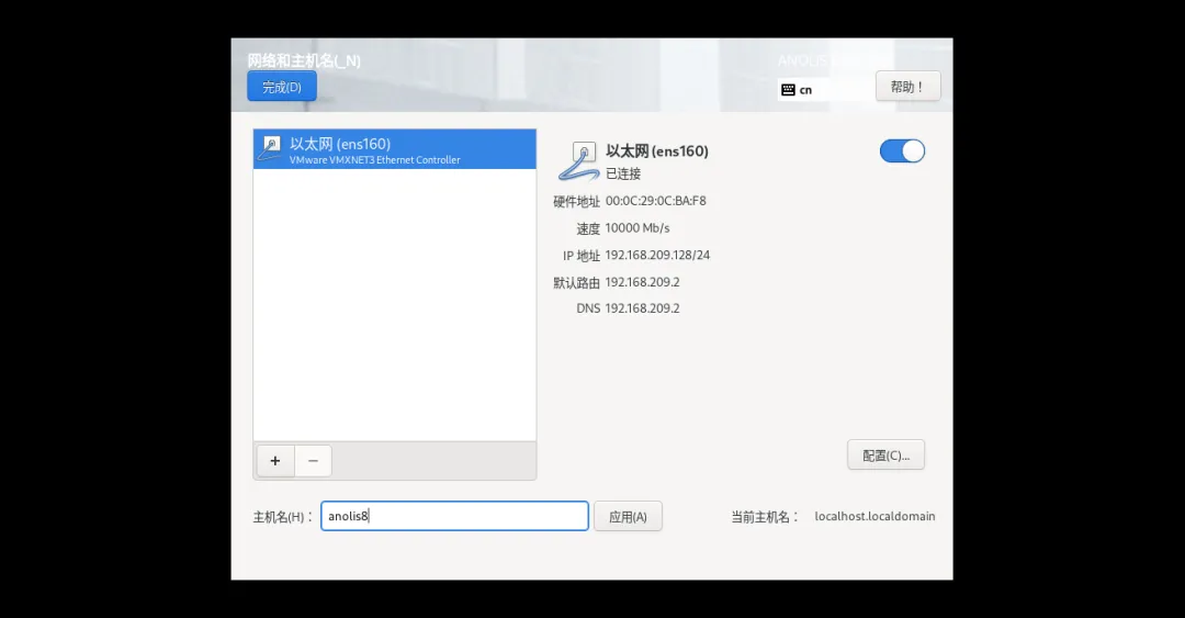 2、配置“网络和主机名”:点击进入,开启“以太网”(显示已连接),主机名自定义(建议“anolis8”),完成,应用后返回;