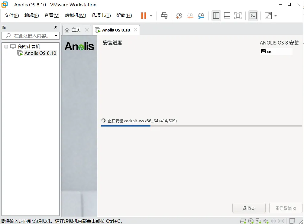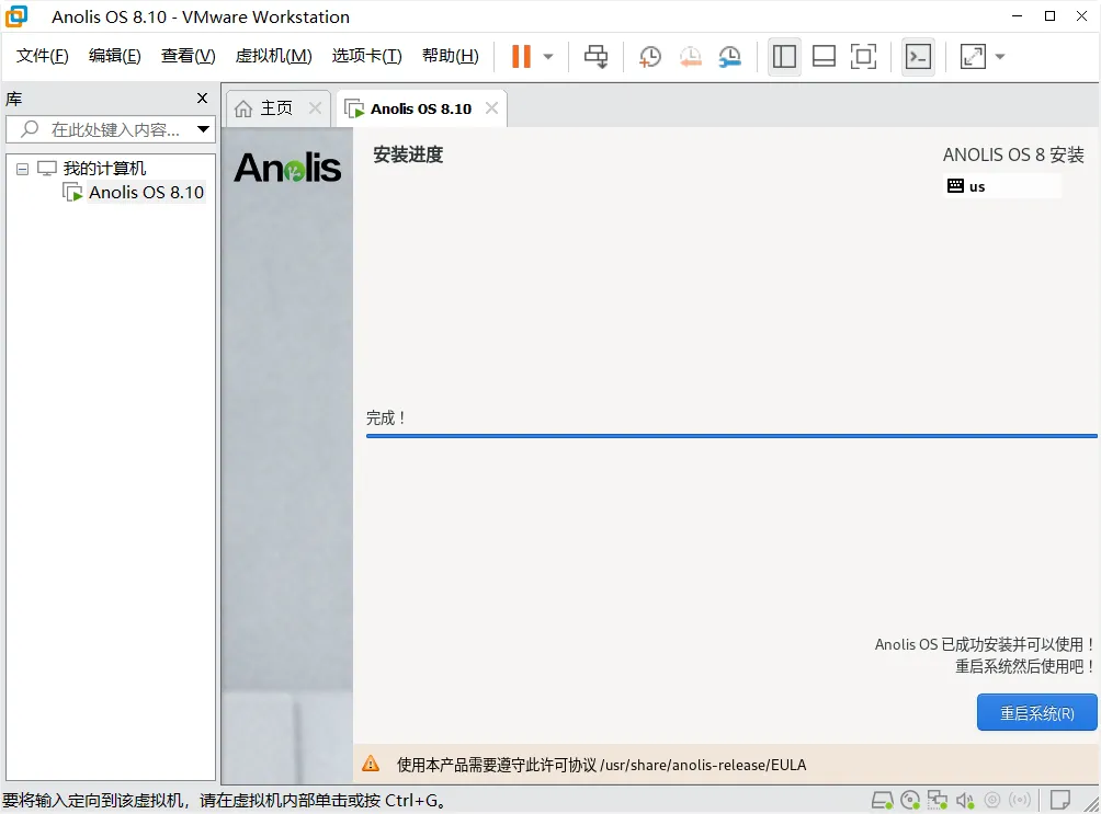 1、安装完成后,点击“重启”;2、启动完成后,出现“anolis login: ”登录界面,输入用户名“root”,按回车;