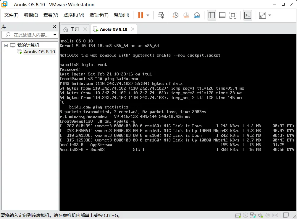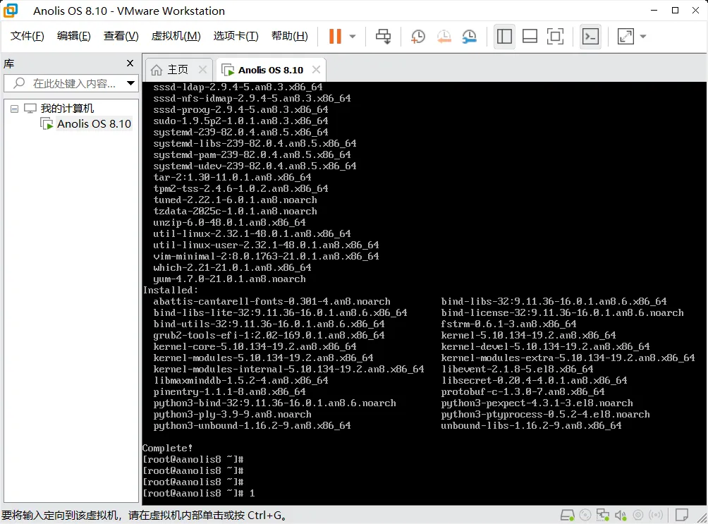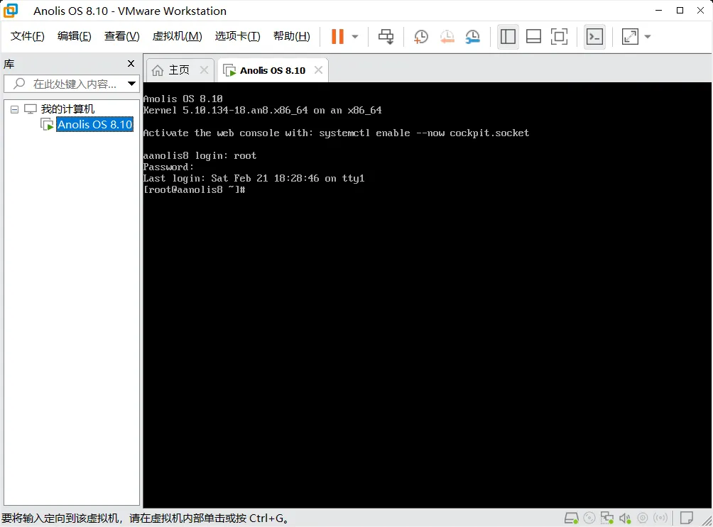 3、输入步骤4设置的根密码(输入时不显示),按回车,出现“[root@anolis8 ~]# ”,说明安装并登录成功!