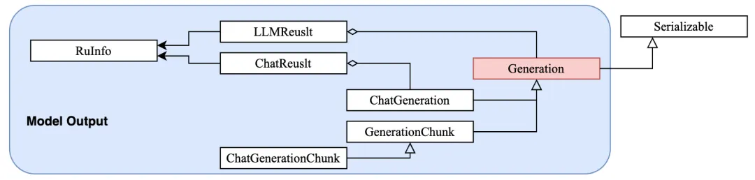 Generation是所有生成结果的基类,ChatGeneration是其对话场景的子类;GenerationChunk和 ChatGenerationChunk则是对应流式输出的片段类。- 输出LLMResult,包含Generation。