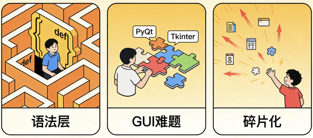 Python自带的标准库缺乏成熟的界面工具。PyQt、Tkinter等第三方库要么学习门槛高,要么设计出的界面停留在“上世纪审美”。更要命的是,很多学生在“如何把代码变成exe”这一步就放弃了 。
