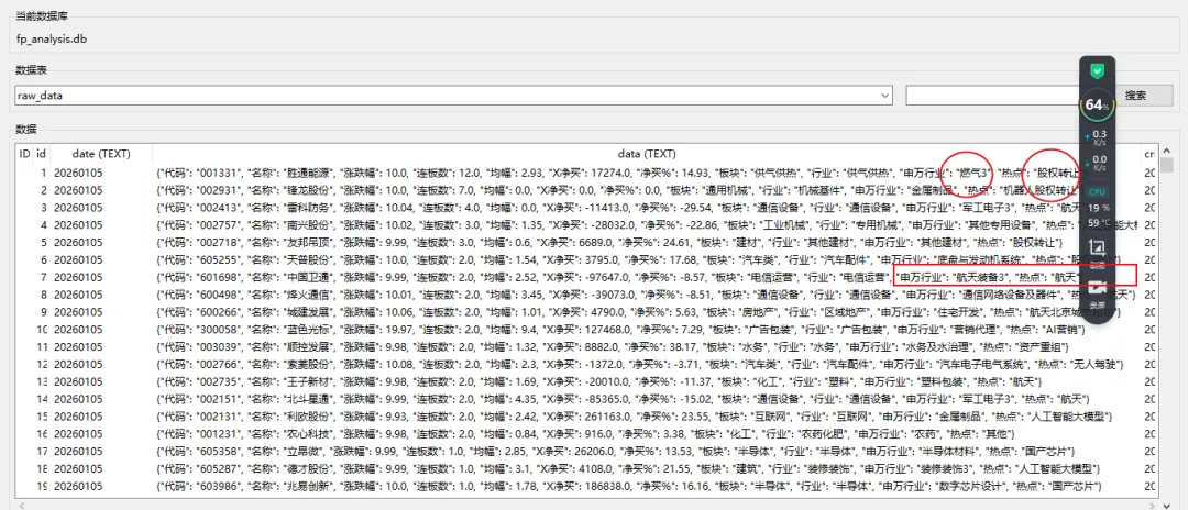 针对原数据库,对其中存储的原始数据中的“申万行业”和“热点”字段进行更新。需要解析每个记录中的data字段(JSON字符串),提取出“申万行业”和“热点”的值,按照规则处理(申万行业取“--”右边,热点取“:”左边),然后更新回数据库。