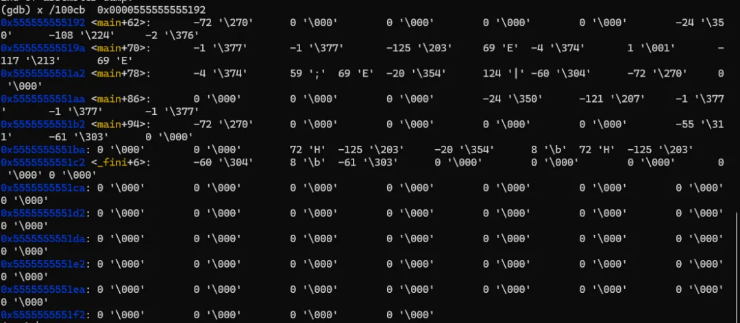 #0 main (argc=1, argv=0x7fffffffd958) at test.c:9x /nfu 其中 n 是字节个数 f 是格式 u 是什么单位查看 x /100cb 也就是 100字节 字符串方法展示 byte