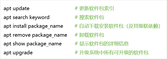 核心目标:apt 的一个重要设计理念是自动处理软件包的依赖关系。它能够自动解析和安装软件包及其依赖项,确保系统中安装的软件包能够正常运行。