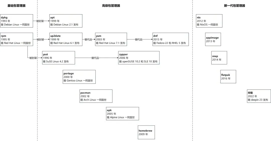另外需要提一下:基础包管理器的存在属于历史遗留问题,只有 Debian 系和 Red Hat 系才存在基础包管理器,后面出来的发行版(如 Arch、Gentoo 等)都是一个高级包管理器管理所有事情,不再单独提供基础包管理器。