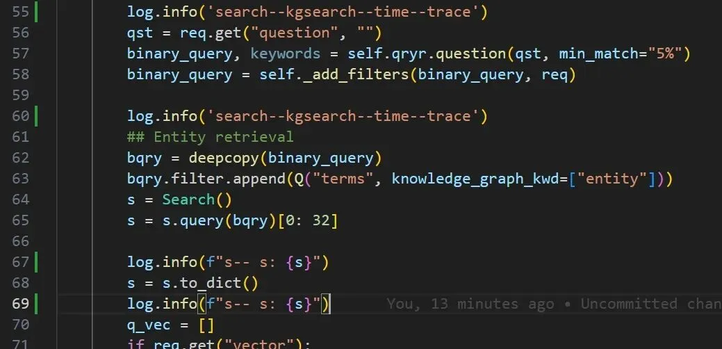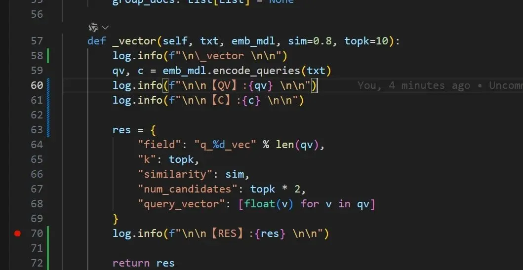 def _vector(self, txt, emb_mdl, sim=0.8, topk=10): qv, c = emb_mdl.encode_queries(txt) return { "field": "q_%d_vec" % len(qv), "k": topk, "similarity": sim, "num_candidates": topk * 2, "query_vector": [float(v) for v in qv] }注:接下来,来个牛的,用debug搞一下。先打个断点。打断点如下: