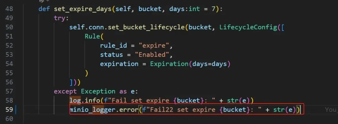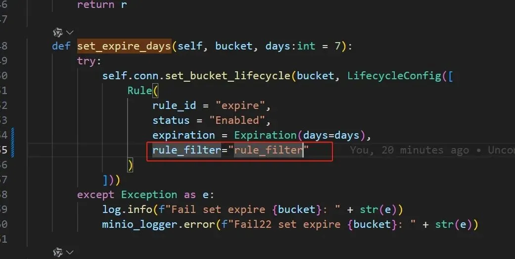 def set_expire_days(self, bucket, days:int = 7): try: self.conn.set_bucket_lifecycle(bucket, LifecycleConfig([ Rule( rule_id = "expire", status = "Enabled", expiration = Expiration(days=days), rule_filter=Filter(prefix="") ) ])) except Exception as e: log.info(f"Fail set expire {bucket}: " + str(e)) minio_logger.error(f"Fail22 set expire {bucket}: " + str(e))注:加了【 rule_filter=Filter(prefix="")】引入了Filter函数,并且传了参,目前这个error消除了,但数据还是返不回来,继续追踪。