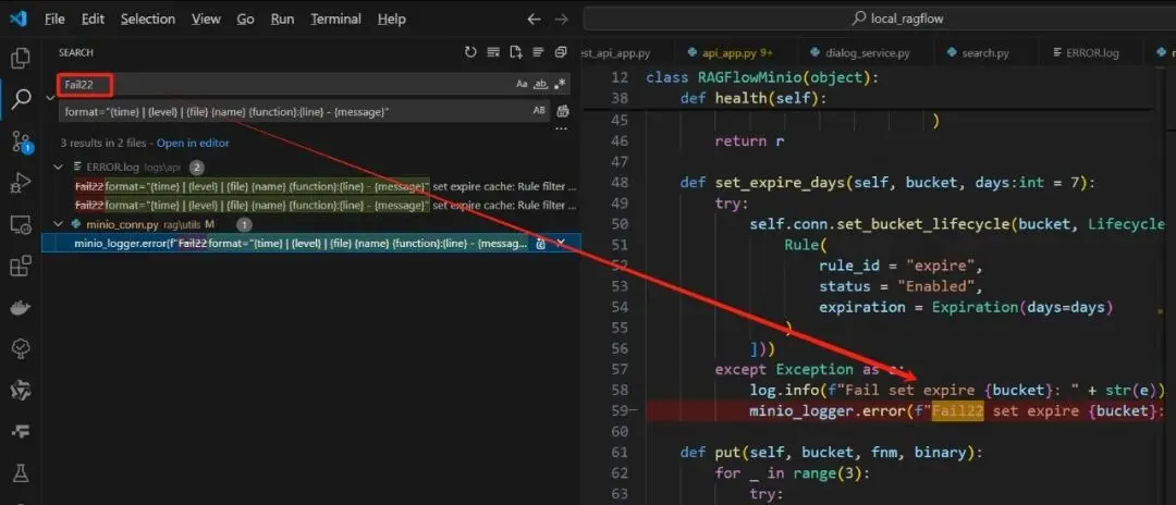 注:那定位这个异常在哪里,可以搜【Fail22 set expire】,或者更粗暴一点,搜Fail22、Fail22 set、Fail22 set expire等。截图如下:
