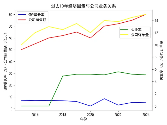 ax1.set_ylabel('GDP增长率(%)/公司销售额(亿元)', color='black')