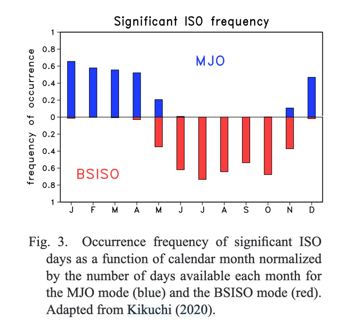 - 双模态特性:热带季节内振荡(ISO)在一年中呈现双模态特征。BSISO模态在6月至10月(JJASO)占主导,而MJO模态在12月至4月(DJFMA)占主导,5月和11月为过渡月。